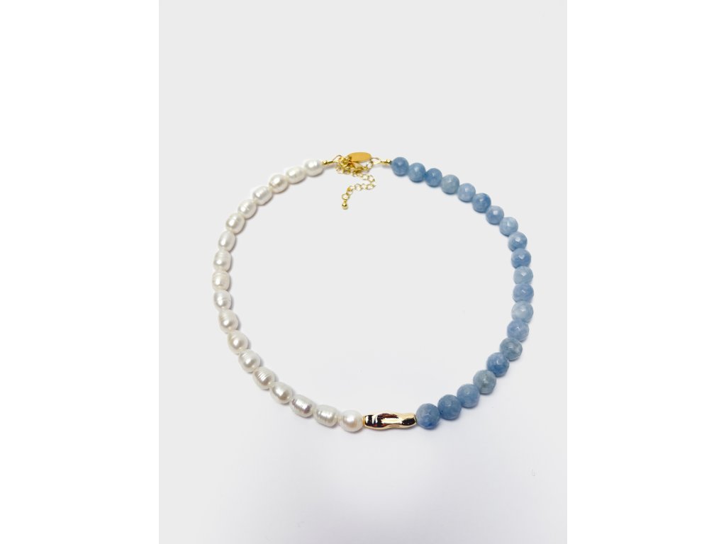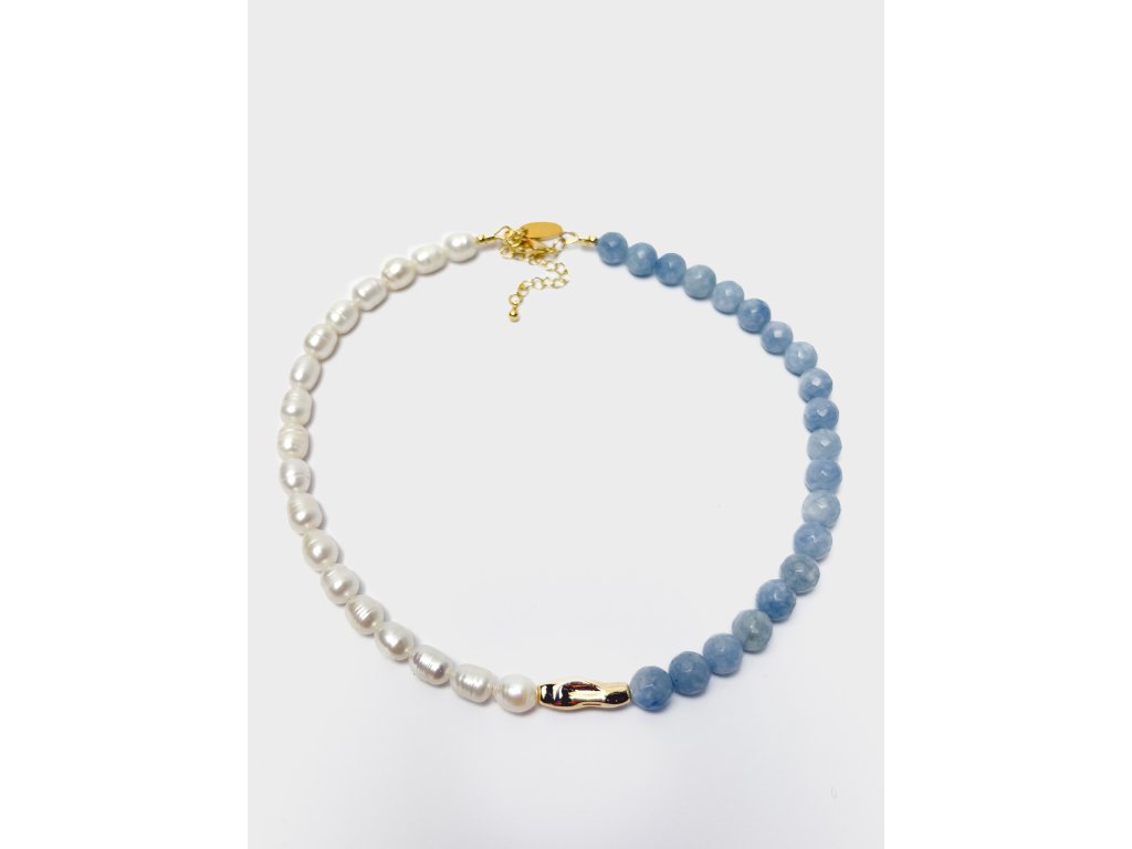 Tento choker propojuje klidný lesk perel s průzračnou svěžestí modrého jadeitu. Jemná asymetrie dvou textur – hladkých perel a broušených korálků – vytváří šperk, který působí vyváženě, přesto osobitě. Uprostřed je spojka ve zlaté barvě, jako symbol sjednocení dvou kvalit: něhy a síly, klasiky a hravosti, jemnosti a svěžesti.