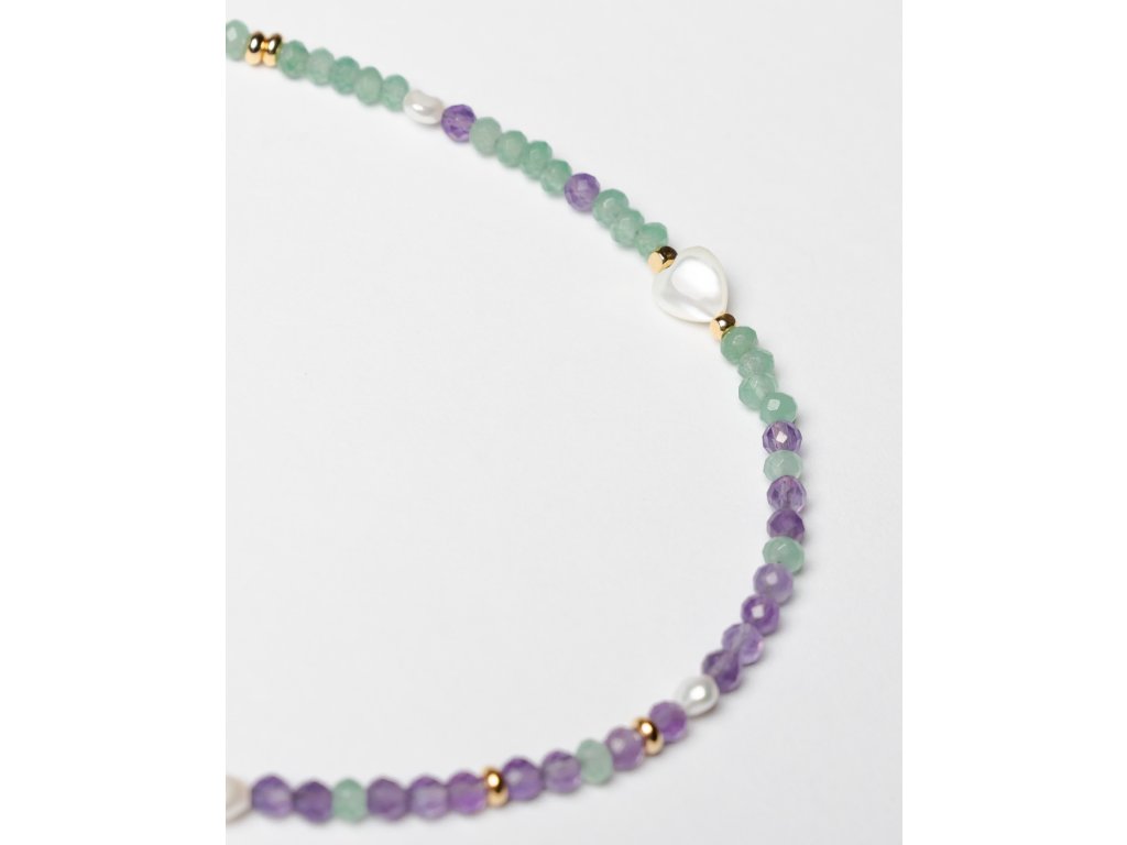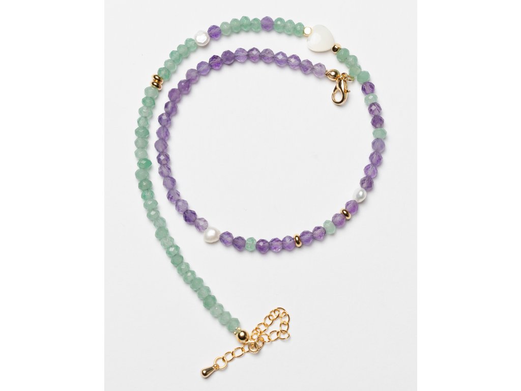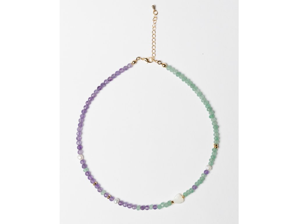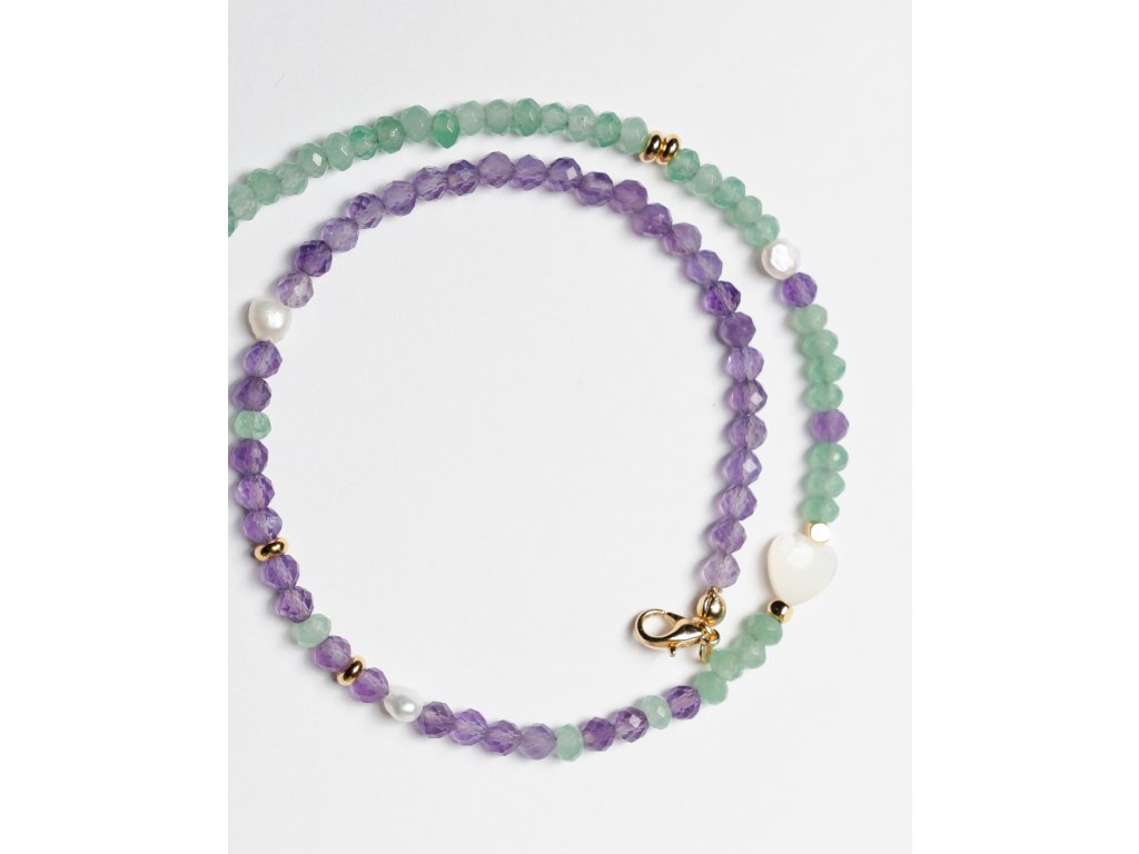 Choker z fialového ametystu a zeleného nefritu s doplňkem perleti přináší do vašeho stylu jedinečnou eleganci. Tento šperk spojuje krásu přírodních kamenů v harmonickém designu, který dodá vašemu vzhledu osobitost a šarm. Každý detail jevyroben s péčí a precizností, což činí tento šperk nejen krásným, ale i jedinečným.
